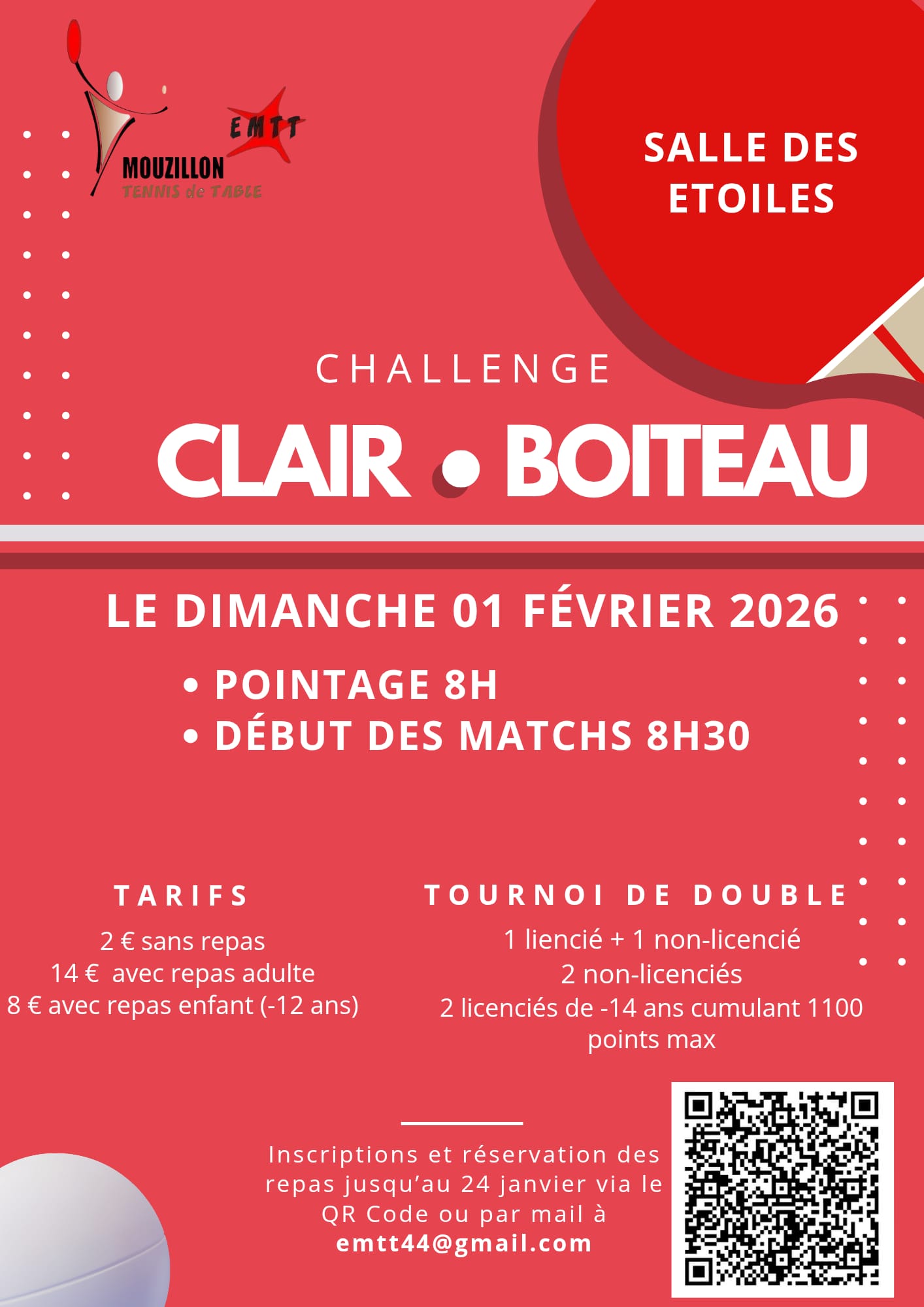 2026 commence tout juste que nous devons préparer notre premier gros événement qui aura lieu le dimanche 1er février 2026. C’est un tournoi de double avec un licencié et un non licencié ou deux non licenciés. Cette journée se clôturera par la traditionnelle galette des rois et un verre de l’amitié aux alentours de 17h. Les inscriptions, pour cette journée, sont à faire sur helloasso ou par mail à emtt44@gmail.com.